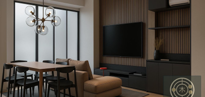 Modern minimalism done right. Clean lines, sleek black finishes, warm wooden accents, and natural light