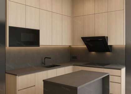 Featuring sleek light wood cabinets, a stylish dark island, and elegant matte black fixtures for a timeless, sophisticated look.